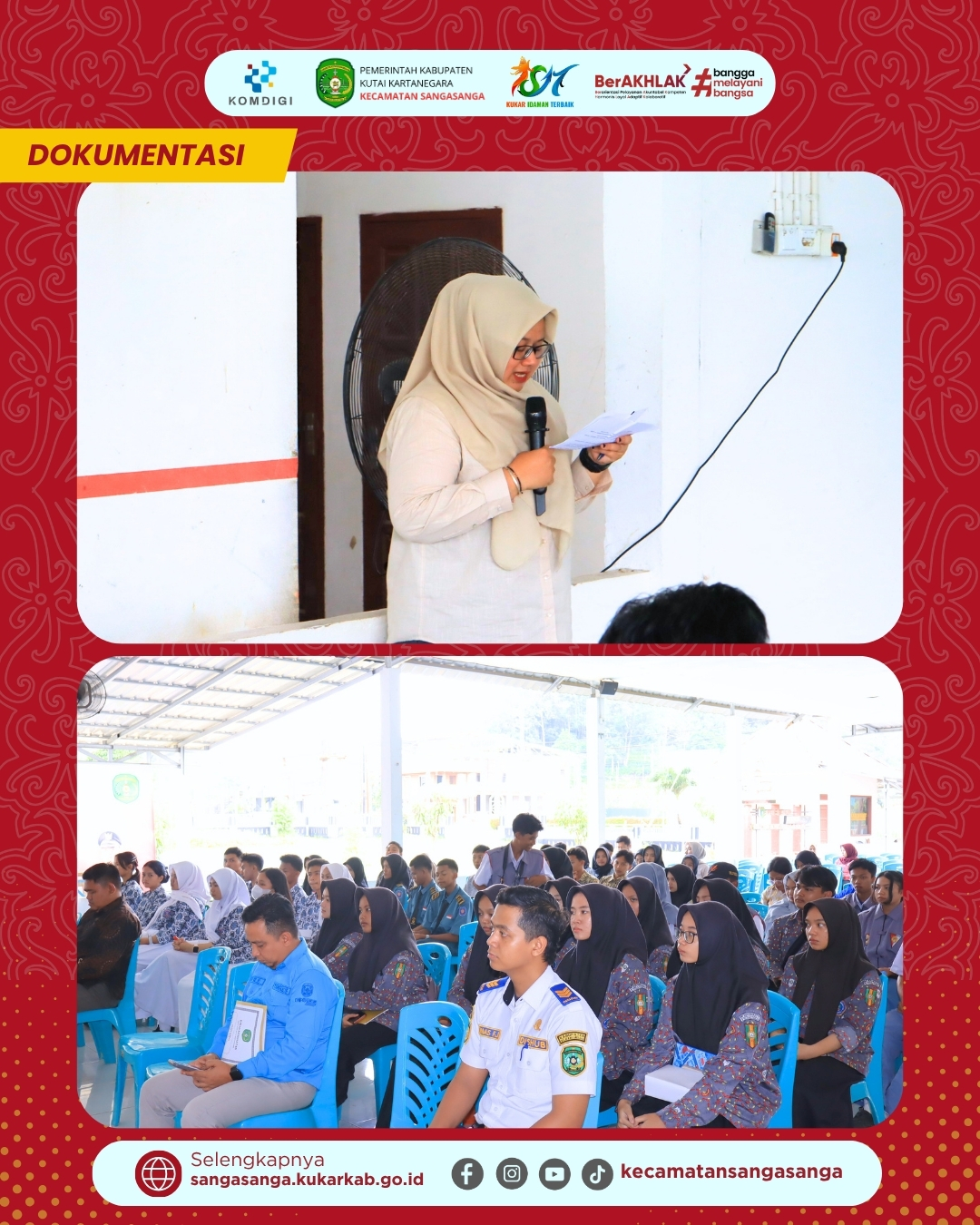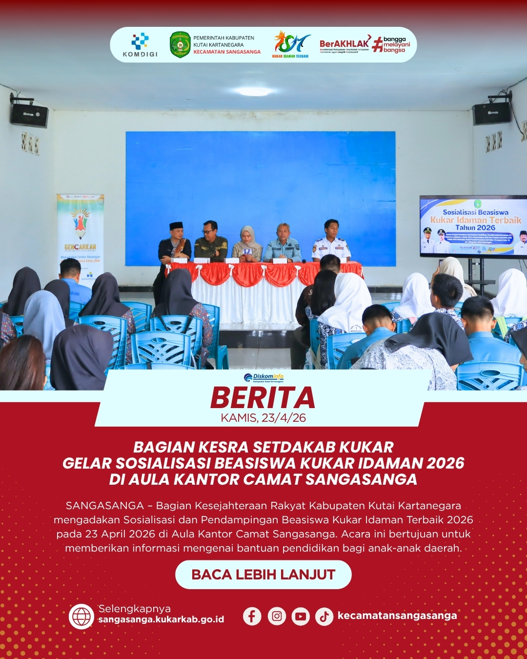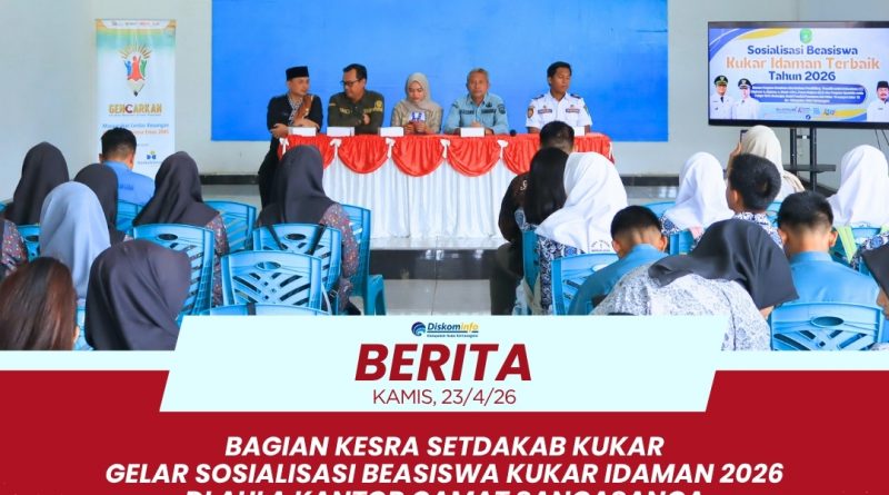 SANGASANGA – Bagian Kesejahteraan Rakyat (Kesra) Sekretariat Daerah Kabupaten Kutai Kartanegara sukses menyelenggarakan kegiatan Sosialisasi dan Pendampingan Beasiswa Kukar Idaman Terbaik Tahun 2026 yang bertempat di Aula Kantor Camat Sangasanga pada Kamis pagi (23/04/2026). Acara ini merupakan bagian dari rangkaian sosialisasi wilayah pantai sesi pertama yang bertujuan memberikan informasi komprehensif mengenai bantuan pendidikan bagi putra-putri daerah. Dalam pelaksanaannya, Kecamatan Sangasanga bertindak sebagai penyedia fasilitas tempat guna mendukung kelancaran program strategis pemerintah kabupaten tersebut. Sejak pagi hari, para peserta yang terdiri dari unsur pendidikan dan pemerintahan dari tiga kecamatan berbeda telah memadati lokasi kegiatan dengan antusias. Penyelenggaraan kegiatan ini didasarkan pada Surat Sekretariat Daerah Nomor B-281/KESRA.SETDAKAB/400.3.3.7/04/2026 mengenai jadwal sosialisasi terpadu.