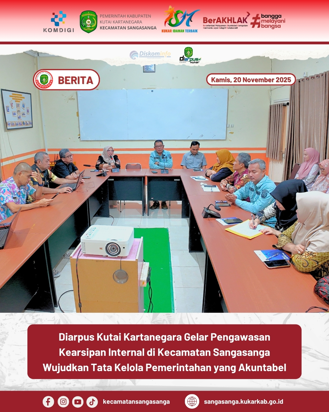 Pemerintah Kabupaten Kutai Kartanegara melalui Dinas Kearsipan dan Perpustakaan (Diarpus) kembali melaksanakan agenda strategisnya pada hari ini, Kamis (20/11/2025). Kegiatan tersebut berupa pelaksanaan Pengawasan Kearsipan Internal Tahun 2025 yang menyasar berbagai perangkat daerah serta kecamatan di wilayah Kutai Kartanegara. Sesuai dengan jadwal resmi yang telah ditetapkan, giliran Kecamatan Sanga Sanga yang menjadi fokus utama pelaksanaan audit kearsipan pada hari ini. Acara pengawasan tersebut dilangsungkan dengan khidmat dan tertib bertempat di Ruang Rapat Kantor Camat Sanga Sanga. Kegiatan ini merupakan wujud nyata komitmen pemerintah daerah dalam upaya menertibkan administrasi sekaligus meningkatkan kualitas tata kelola pemerintahan yang akuntabel.
