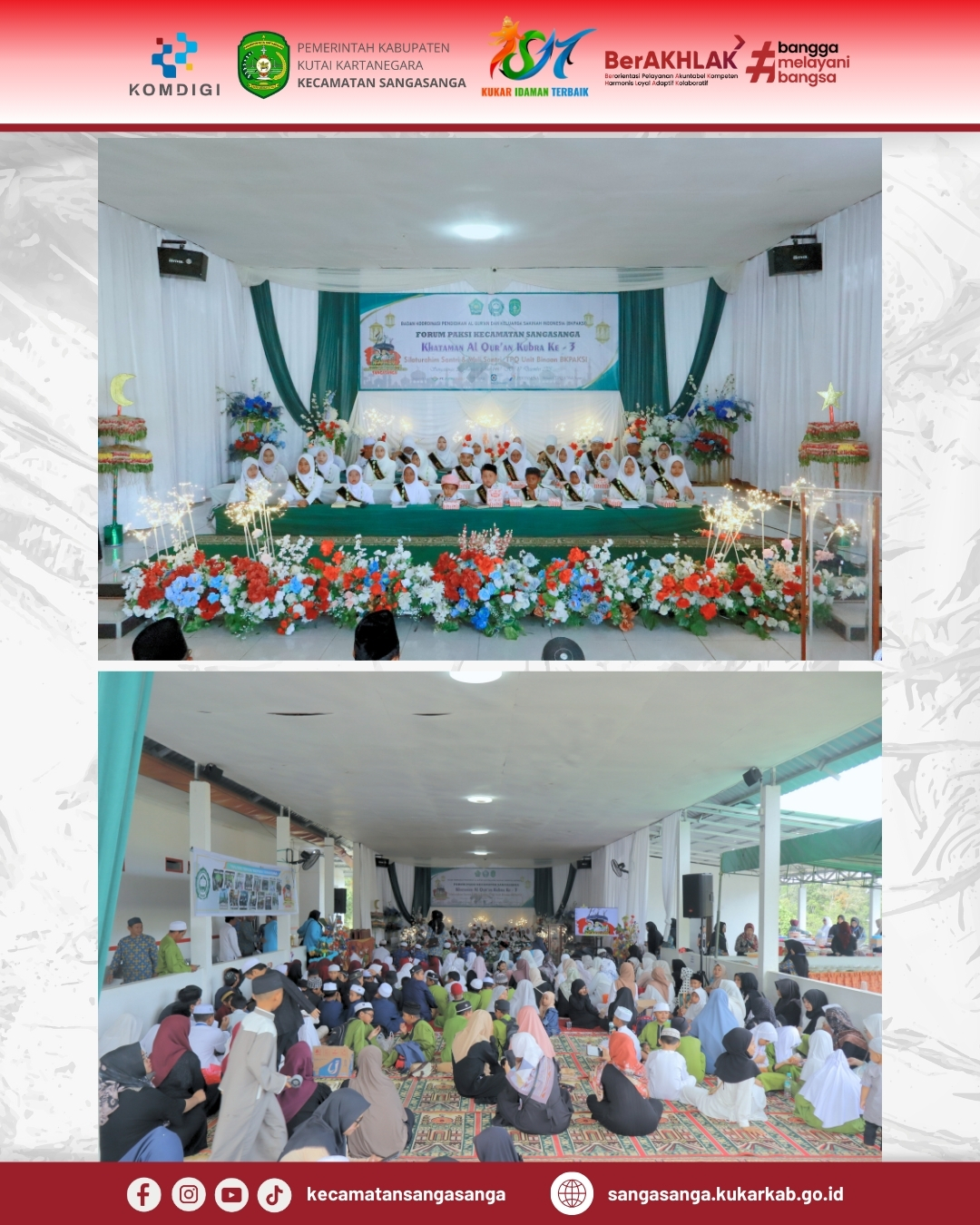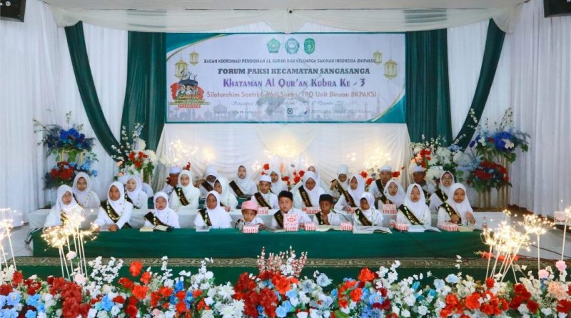 SANGASANGA – Aula Kantor Camat Sangasanga menjadi saksi khidmatnya pelaksanaan kegiatan Khataman Al-Qur’an Kubro ke-3 yang diselenggarakan oleh Forum Koordinasi Pendidikan Al-Qur’an dan Keluarga Sakinah Indonesia (BKPAKSI) Kecamatan Sangasanga pada Rabu (17/12/2025). Acara ini merupakan agenda rutin yang bertujuan untuk mensyukuri pencapaian para santri dalam menyelesaikan pembacaan kalam ilahi sekaligus mempererat silaturahim antar lembaga pendidikan. Rangkaian kegiatan dimulai sejak pagi hari pukul 07.00 WITA dengan titik kumpul massa di Ruang Terbuka Hijau (RTH) sebelum bergerak menuju lokasi utama di Aula Kecamatan. Kehadiran ratusan santri beserta wali santri memberikan nuansa religius yang sangat kental di lingkungan kantor pemerintahan kecamatan pagi ini. Melalui kegiatan ini, diharapkan motivasi anak-anak di Sangasanga untuk terus mencintai dan mengamalkan nilai-nilai Al-Qur’an semakin meningkat seiring bertambahnya usia mereka.