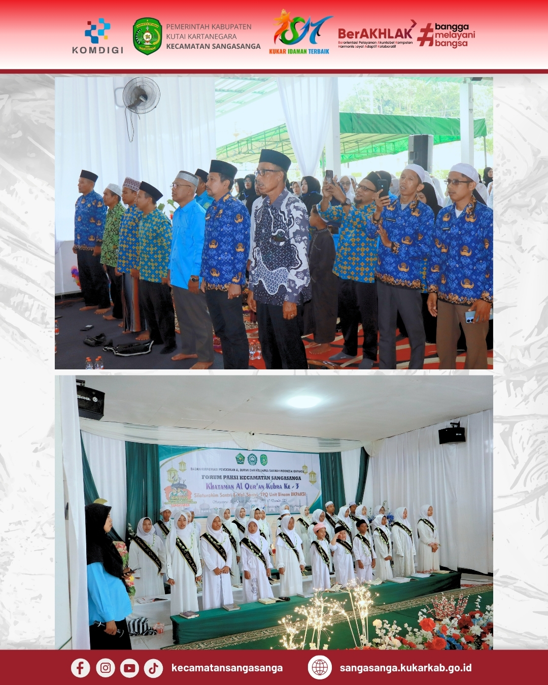 Rangkaian acara diawali dengan prosesi kirab santri yang menempuh rute dari RTH menuju Aula Kecamatan dengan tertib dan penuh antusias. Sesampainya di lokasi, acara dibuka dengan menyanyikan lagu kebangsaan Indonesia Raya serta Mars BKPAKSI guna menumbuhkan rasa nasionalisme dan kebanggaan terhadap organisasi. Pembacaan doa yang dipimpin oleh Kepala KUA Sangasanga menambah kekhusyukan suasana sebelum memasuki sesi sambutan-sambutan formal. Ketua Umum Forum PAKSI Sangasanga, Ustadz Al Amin, dalam laporannya menyampaikan apresiasi kepada seluruh guru mengaji dan orang tua yang telah sabar mendampingi para santri. Ia menegaskan bahwa khataman ini bukanlah akhir dari proses belajar, melainkan awal untuk mendalami makna Al-Qur’an lebih jauh lagi dalam kehidupan sehari-hari.