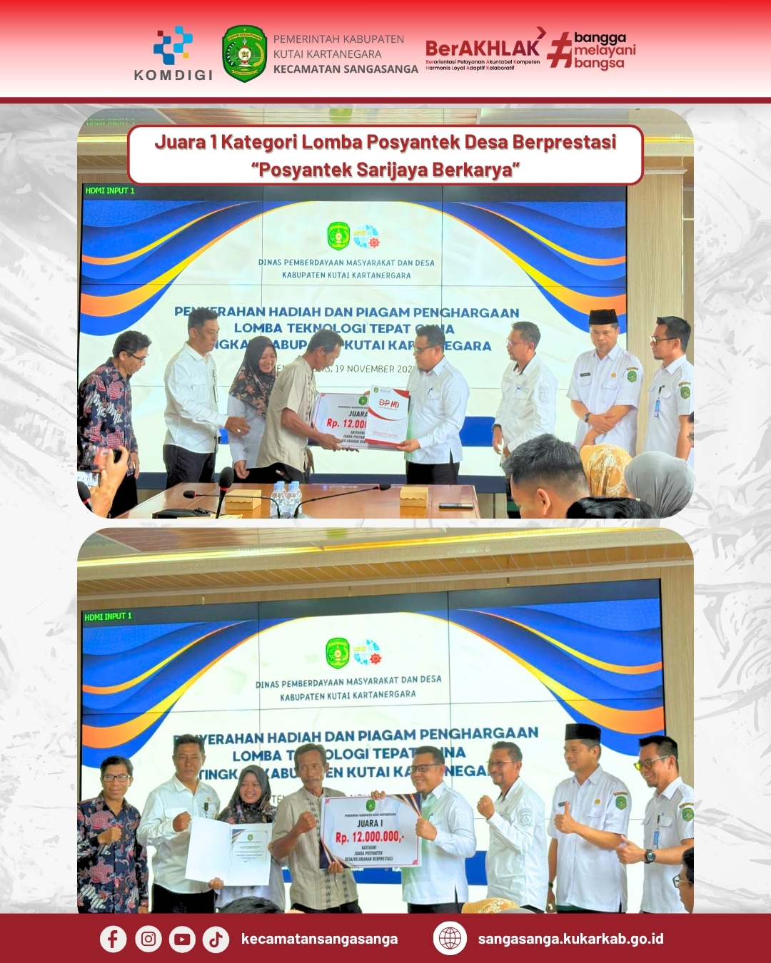 Prestasi puncak diraih oleh Kelompok Pos Pelayanan Teknologi Tepat Guna (POSYANTEK) Kelurahan Sarijaya yang sukses menyabet gelar Juara 1 untuk Kategori Kelompok Posyantek Tingkat Kelurahan Se-Kabupaten Kutai Kartanegara. Penghargaan bergengsi ini diterima langsung oleh Bapak Sutrimo selaku Ketua Kelompok, yang sebelumnya terdaftar sebagai peserta kategori Lomba Posyantek Desa Berprestasi. Kemenangan ini didasari oleh inovasi brilian berupa pemanfaatan limbah sisa produksi UMKM Amplang yang diolah menjadi pelet pakan ikan berkualitas. Terobosan ini dinilai sangat solutif karena tidak hanya mengatasi permasalahan limbah industri rumahan yang melimpah di wilayah tersebut, tetapi juga menciptakan rantai ekonomi baru bagi para pembudidaya ikan. Dengan teknologi ini, limbah yang tadinya terbuang kini memiliki nilai ekonomis tinggi dan mendukung keberlanjutan lingkungan hidup di sekitar sentra produksi amplang.