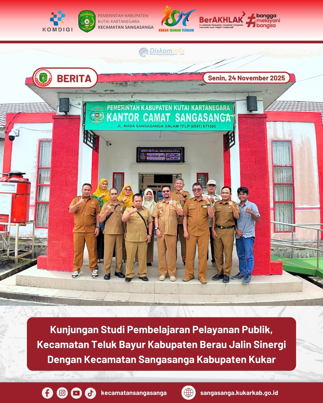 Kecamatan Sangasanga, Kabupaten Kutai Kartanegara, menjadi tuan rumah dalam sebuah agenda penting peningkatan mutu tata kelola pemerintahan, menyambut kunjungan studi pembelajaran dari delegasi Kecamatan Teluk Bayur, Kabupaten Berau, pada hari Senin, 24 November 2025. Pertemuan yang diselenggarakan di Ruang Rapat Kantor Camat Sangasanga ini fokus pada eksplorasi dan adopsi praktik terbaik serta inovasi terdepan yang berhasil diimplementasikan oleh Sangasanga dalam ranah pelayanan publik. Kunjungan ini merupakan wujud inisiatif strategis dari Teluk Bayur guna memperkaya khazanah pengetahuan Aparatur Sipil Negara (ASN) mereka, khususnya terkait administrasi kepemerintahan dan peningkatan kualitas layanan yang berorientasi pada masyarakat. Soliditas dan sinergi antar-kecamatan dari dua kabupaten yang berbeda ini menunjukkan komitmen yang kuat dari pemerintah daerah terhadap reformasi birokrasi yang progresif dan berbasis kinerja. Diharapkan, proses transfer pengetahuan ini akan menghasilkan standardisasi pelayanan yang lebih responsif, efisien, dan akuntabel di masa mendatang.
