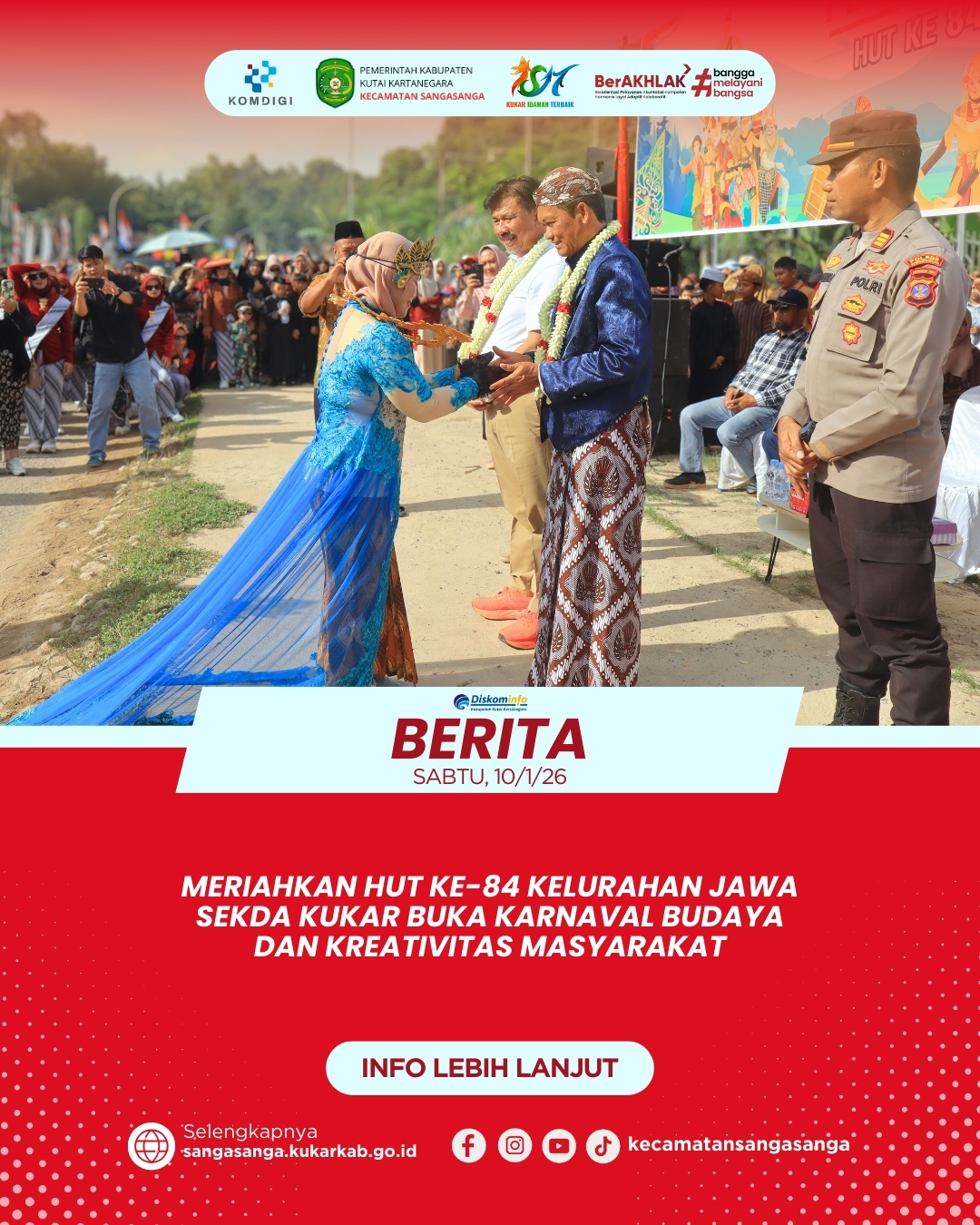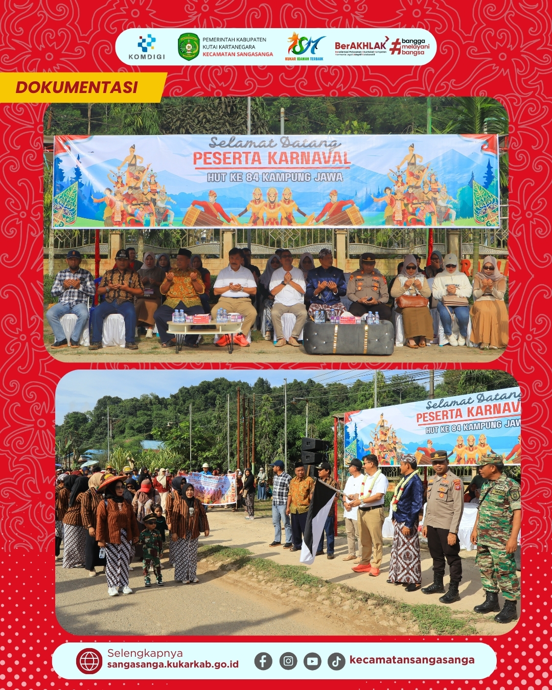 SANGASANGA – Kelurahan Jawa di Kecamatan Sangasanga merayakan hari jadinya yang ke-84 dengan penuh kemeriahan melalui penyelenggaraan Karnaval Budaya pada Sabtu pagi. Acara ini dihadiri langsung oleh Sekretaris Daerah Kabupaten Kutai Kartanegara, Bapak Dr. H. Sunggono, M.M., yang hadir mewakili Bupati Kutai Kartanegara untuk membuka rangkaian kegiatan. Kehadiran beliau disambut hangat oleh Camat Sangasanga, Bapak Muhammad Dachriansyah, S.Sos., M.Si., serta Lurah Jawa, Bapak Badriansyah, S.Sos. Turut hadir dalam jajaran undangan antara lain Danramil Sangasanga, Kapolsek Sangasanga, seluruh Lurah se-Kecamatan Sangasanga, serta personel pengamanan dari unsur TNI, Polri, Linmas Sangasanga, dan Linmas Kelurahan Jawa yang memastikan acara berjalan dengan kondusif.