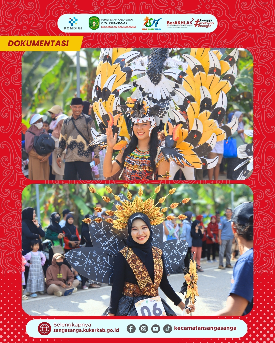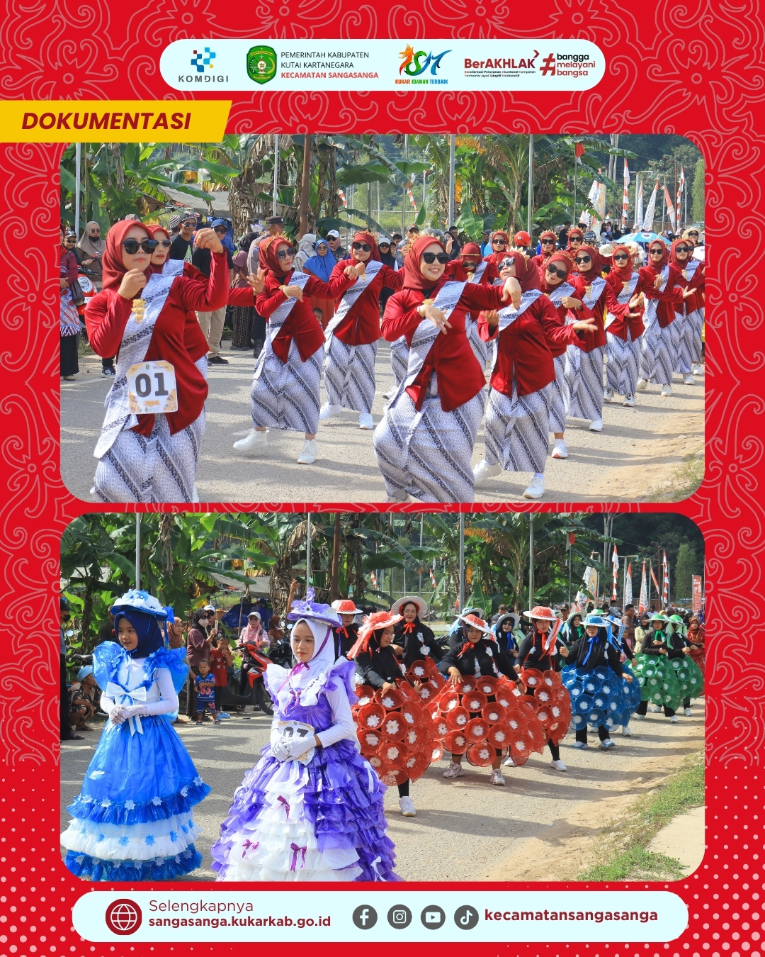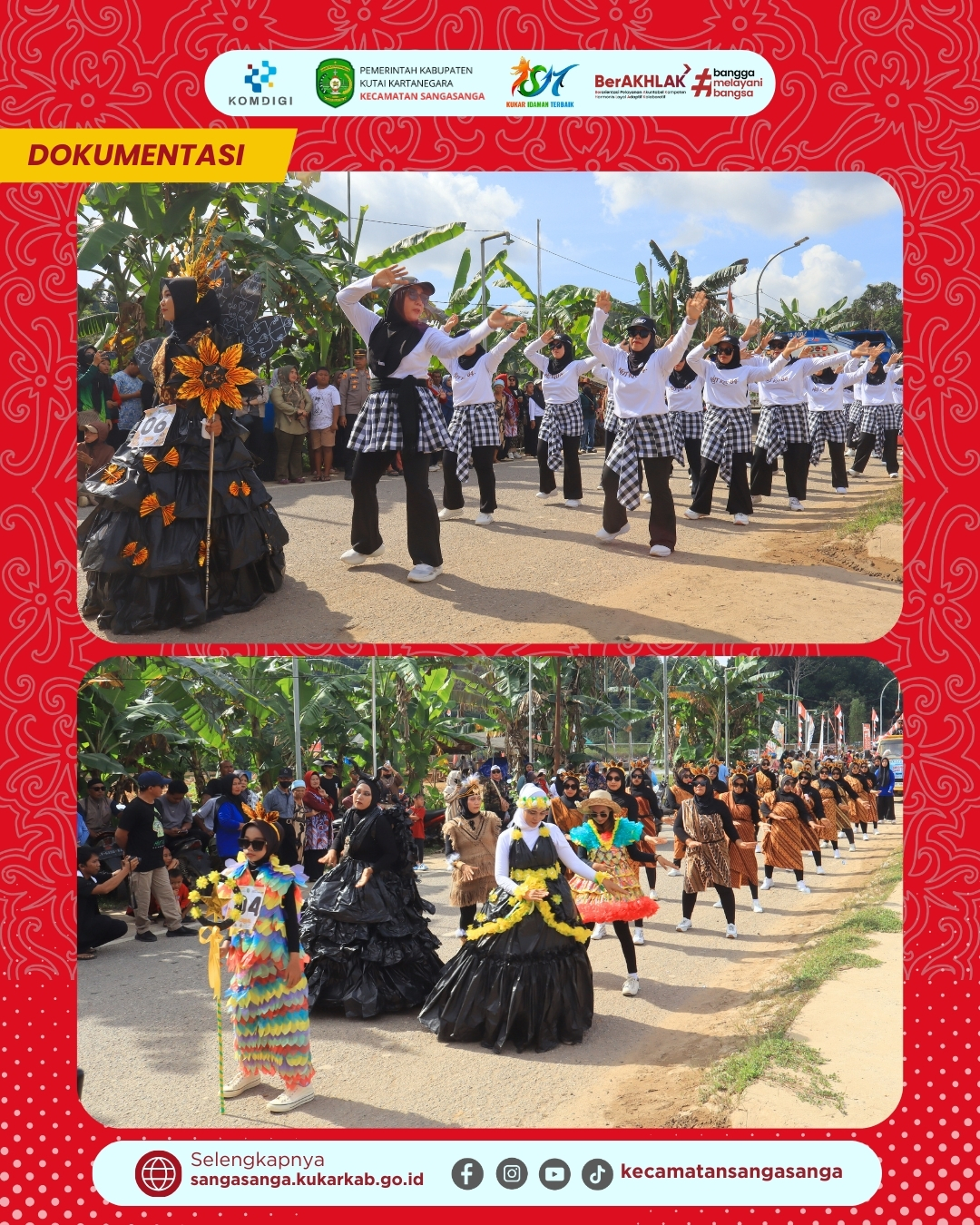 Lomba karnaval sendiri diikuti dengan penuh semangat oleh peserta dari RT 01 hingga RT 09 yang masing-masing menampilkan konsep unik dan menarik. Setiap RT membawa tema berbeda, mulai dari iring-iringan baju adat nusantara yang berwarna-warni hingga kostum daur ulang kreatif dari kardus dan kertas yang dibentuk menyerupai burung Garuda. Urutan keberangkatan peserta dilakukan berdasarkan nomor urut yang telah diundi pada hari sebelumnya untuk menjaga ketertiban barisan di sepanjang rute jalan. Kemeriahan semakin memuncak saat barisan Damkar Sangasanga ikut serta meramaikan pawai di barisan belakang, sekaligus memberikan edukasi kepada masyarakat. Kegiatan ini tidak hanya menjadi ajang hiburan, tetapi juga menjadi sarana mempererat tali silaturahmi antarwarga di Kecamatan Sangasanga.
