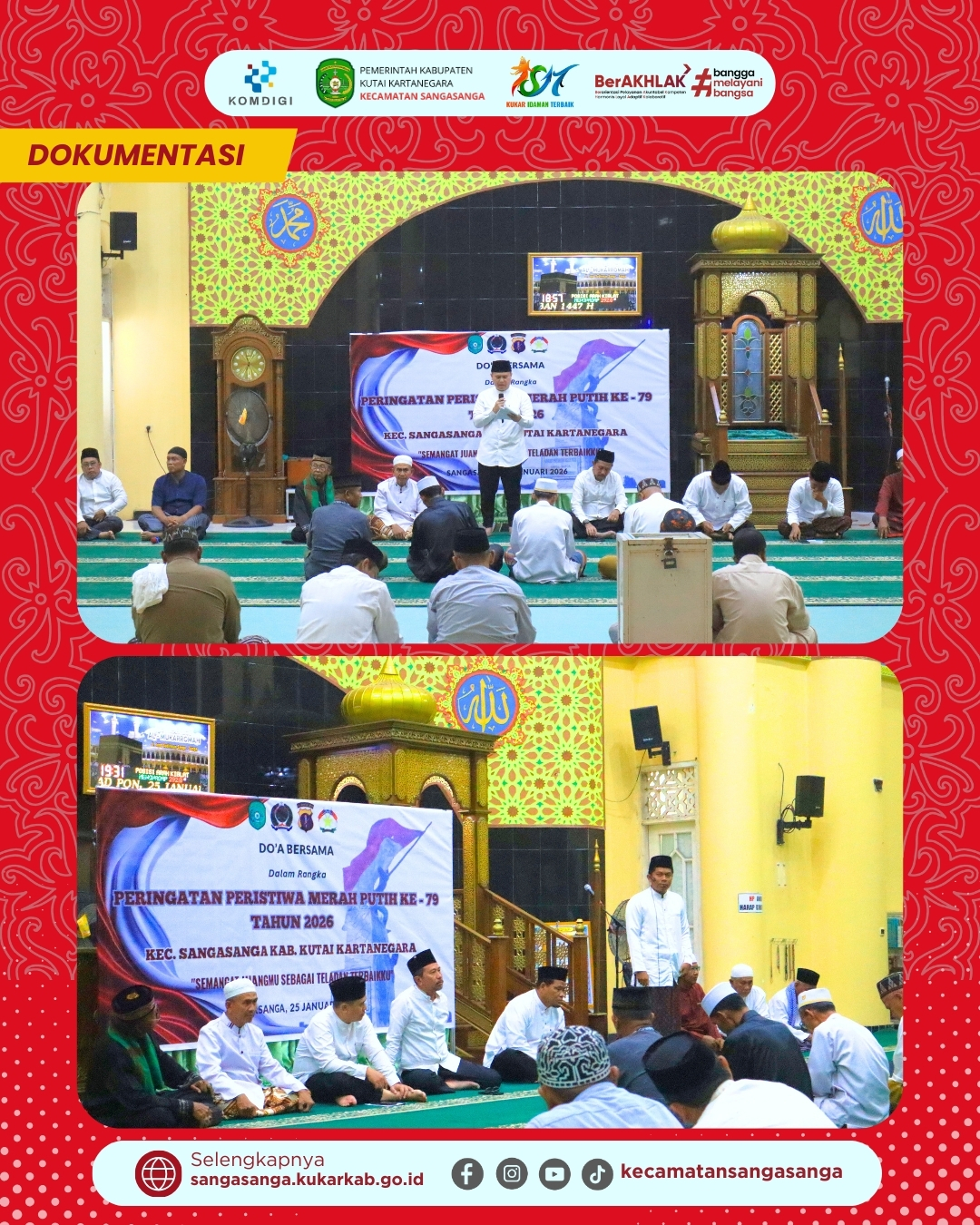 Sangasanga, 25 Januari 2026 – Suasana khusyuk menyelimuti Masjid Besar Al Mukarromah di Kecamatan Sangasanga pada hari Minggu malam ini, bertepatan dengan agenda “Doa untuk Para Pahlawan”. Kegiatan religius ini merupakan rangkaian utama dalam memperingati 79 tahun Peristiwa Merah Putih, sebuah momentum bersejarah perlawanan rakyat Sangasanga terhadap penjajah. Acara ini menurut rundown acara dihadiri langsung oleh jajaran penting Pemerintah Kabupaten Kutai Kartanegara, termasuk Asisten 1, Kepala Organisasi Perangkat Daerah (OPD), Bagian Kesejahteraan Rakyat (Kesra), Dinas Perhubungan (Dishub), serta tim Protokoler yang berbaur bersama Panitia Lokal dan masyarakat setempat. Kehadiran para pejabat dan elemen masyarakat ini menjadi bukti nyata bahwa semangat nasionalisme dan penghormatan terhadap jasa para syuhada bangsa masih tertanam kuat di sanubari warga Kutai Kartanegara.
