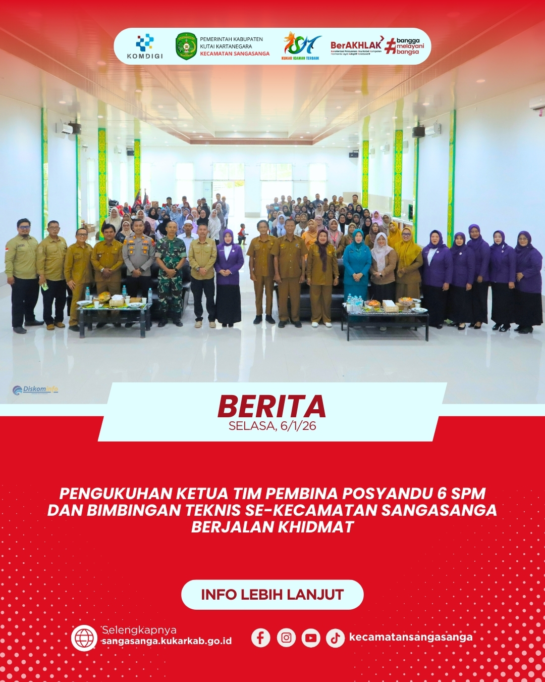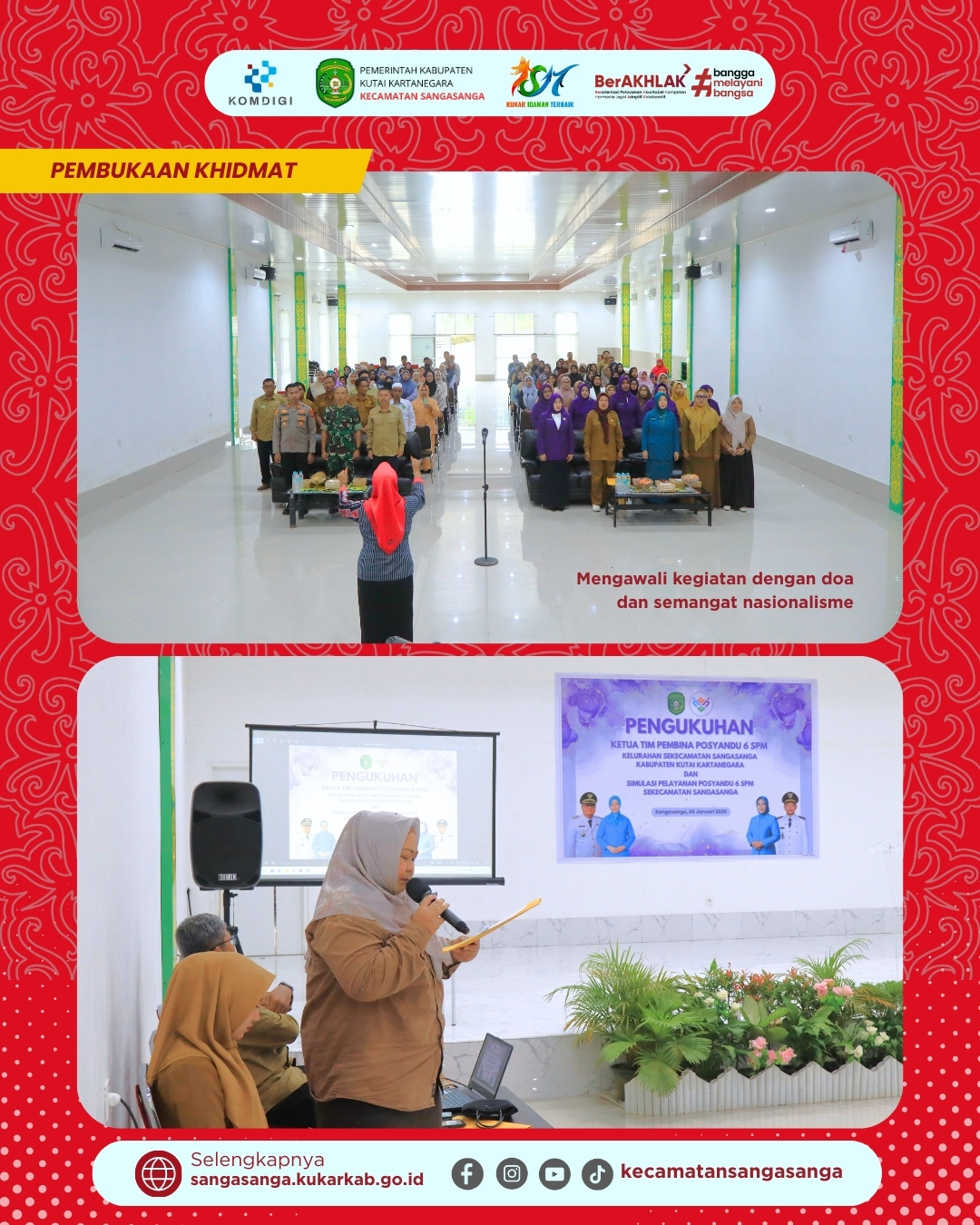 SANGASANGA – Pemerintah Kecamatan Sangasanga menyelenggarakan acara pengukuhan Ketua Tim Pembina Posyandu 6 Standar Pelayanan Minimal (SPM) tingkat Kelurahan se-Kecamatan Sangasanga pada Selasa, 6 Januari 2026. Kegiatan yang berlangsung di Ruang Pertemuan Green House Putra Ramli ini dimulai tepat pukul 09.00 WITA dengan dipandu oleh pembawa acara (MC) yang membuka prosesi secara formal. Sebagai bentuk nasionalisme dan penghormatan kepada negara, seluruh hadirin berdiri tegak untuk menyanyikan lagu kebangsaan Indonesia Raya sebagai pembuka rangkaian acara. Suasana khidmat menyelimuti ruangan saat pembacaan doa dipanjatkan guna memohon kelancaran serta keberkahan bagi para pengurus yang akan mengemban amanah baru. Seluruh rangkaian pembukaan ini menjadi dasar semangat pelayanan bagi para kader Posyandu di wilayah Sangasanga.