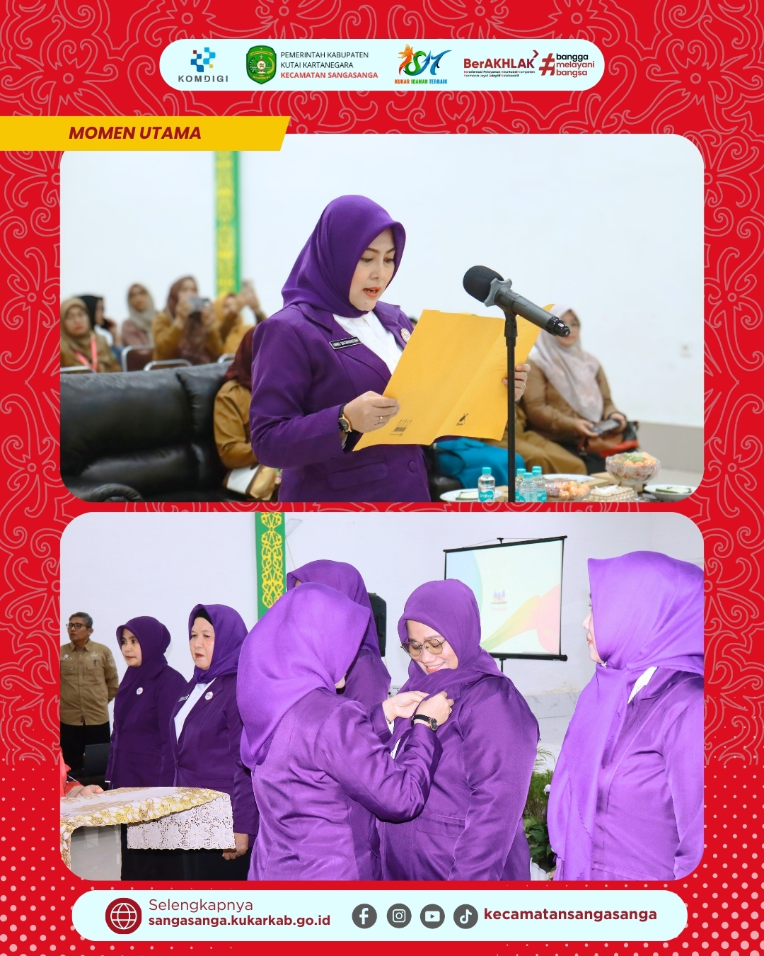 Acara inti dimulai dengan pembacaan Surat Keputusan (SK) pengangkatan pengurus sebagai legalitas formal bagi para Ketua Tim Pembina yang baru. Prosesi kemudian dilanjutkan dengan momen penting berupa penyematan atau pemasangan pin Posyandu 6 SPM secara simbolis kepada para pengurus yang dilantik. Penyematan pin ini dilakukan langsung oleh Ketua Posyandu 6 SPM Kecamatan Sangasanga, Ibu Ummu Kulsum Dachriansyah, yang merupakan istri dari Camat Sangasanga. Dalam prosesi tersebut, terlihat para pengurus berbaris rapi mengenakan seragam ungu seraya menerima tanda jabatan dengan penuh dedikasi. Simbolisme ini menandai dimulainya tanggung jawab baru dalam meningkatkan derajat kesehatan masyarakat di tingkat kelurahan.