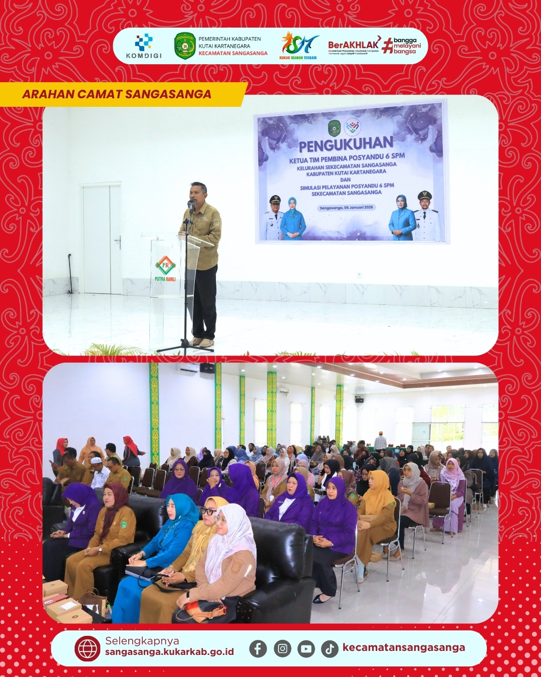 Setelah prosesi pelantikan selesai, Camat Sangasanga, Muhammad Dachriansyah, S.Sos., M.Si., memberikan sambutan resmi di hadapan seluruh undangan yang hadir. Dalam arahannya, beliau menekankan pentingnya peran Posyandu 6 SPM dalam memberikan pelayanan yang merata dan berkualitas di seluruh wilayah Sangasanga. Beliau juga memberikan apresiasi setinggi-tingginya kepada para kader yang bersedia menjadi ujung tombak pelayanan kesehatan di masyarakat. Camat berharap agar pengukuhan ini bukan sekadar seremoni, melainkan langkah nyata dalam mewujudkan kesejahteraan keluarga. Sambutan tersebut diakhiri dengan pesan motivasi agar seluruh tim pembina menjaga soliditas dan komunikasi antarinstansi.