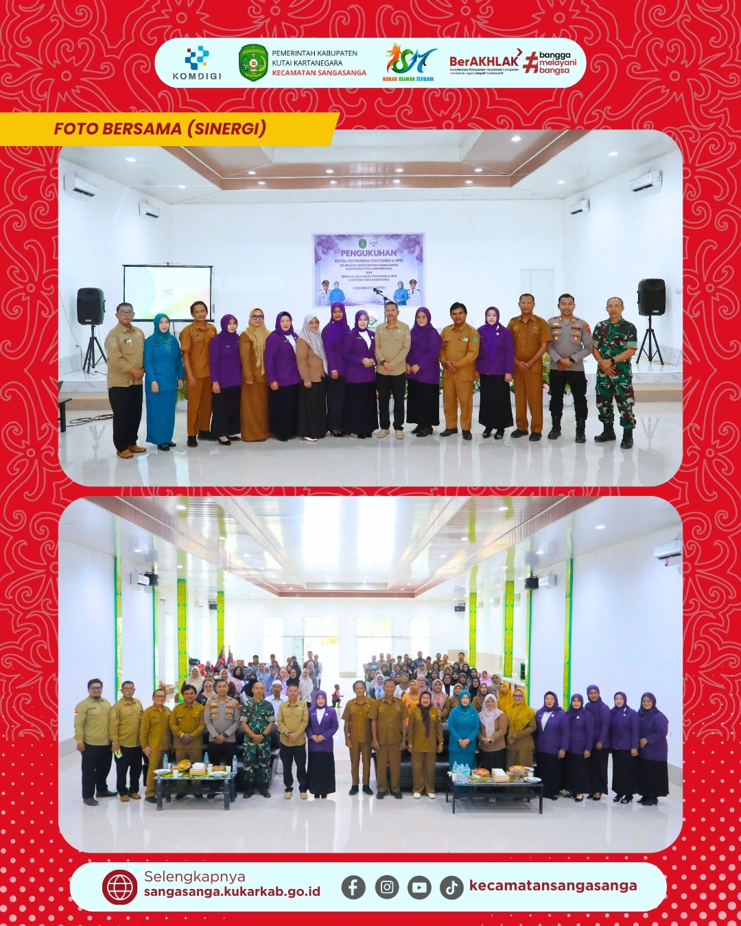 Sebagai bentuk dokumentasi dan kenang-kenangan, acara dilanjutkan dengan sesi foto bersama yang melibatkan seluruh jajaran pimpinan dan peserta. Dalam sesi ini, tampak hadir Camat Sangasanga bersama unsur Forkopimcam seperti Danramil dan Kapolsek, serta perwakilan dari Puskesmas dan para Lurah. Foto bersama tersebut menunjukkan kebersamaan yang erat antara pemerintah kecamatan, aparat keamanan, dan tim pembina Posyandu. Seluruh peserta tampak antusias mengikuti instruksi fotografer untuk mengabadikan momen bersejarah ini dengan formasi lengkap. Kebersamaan ini menjadi simbol komitmen bersama dalam menyukseskan program-program pemerintah di bidang kesehatan masyarakat.