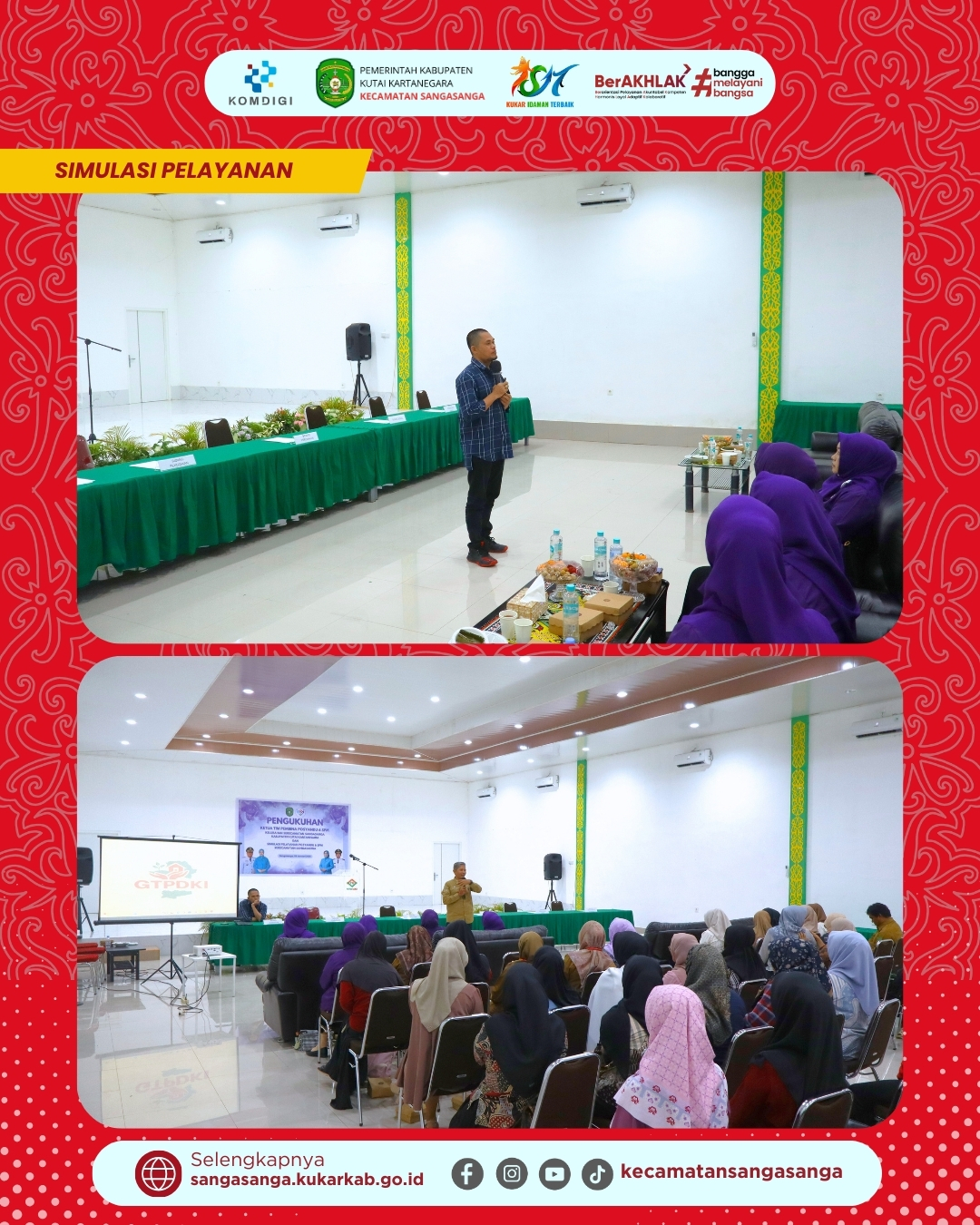 Memasuki agenda terakhir, kegiatan beralih ke sesi teknis berupa Simulasi Pelayanan Posyandu 6 SPM dan Bimbingan Teknis Juknis Pelaksanaan. Materi pada sesi ini disampaikan secara mendalam oleh pemateri dari DPMPTSP Kabupaten Kutai Kartanegara untuk memberikan pemahaman komprehensif terkait prosedur operasional standar. Para peserta diajak memahami setiap tahapan pelayanan agar dapat diimplementasikan secara akurat di kelurahan masing-masing. Diskusi interaktif mewarnai jalannya bimbingan teknis ini, di mana para peserta aktif bertanya mengenai kendala di lapangan. Dengan selesainya sesi materi ini, diharapkan seluruh Ketua Tim Pembina yang baru dikukuhkan siap menjalankan tugasnya dengan bekal pengetahuan yang mumpuni.