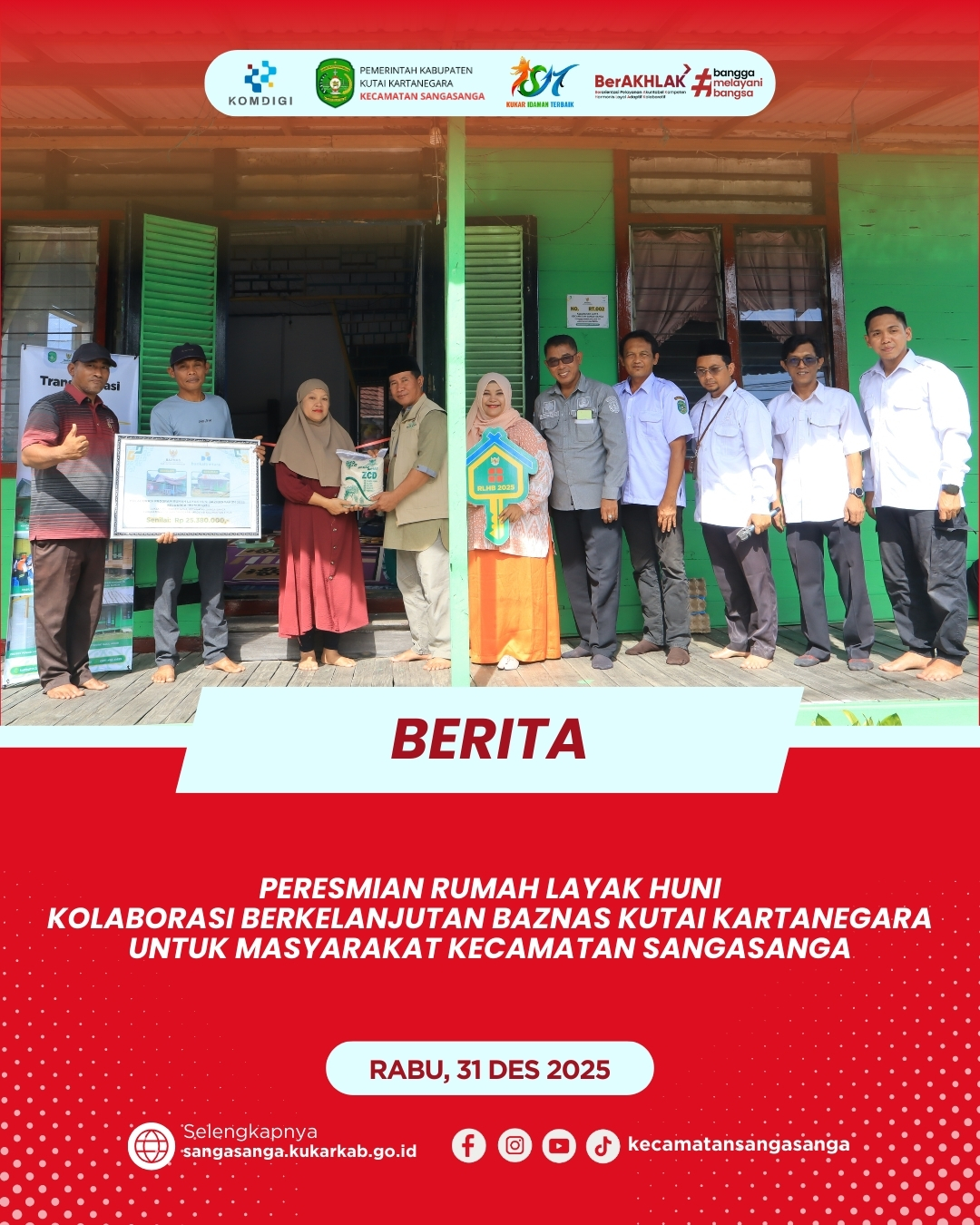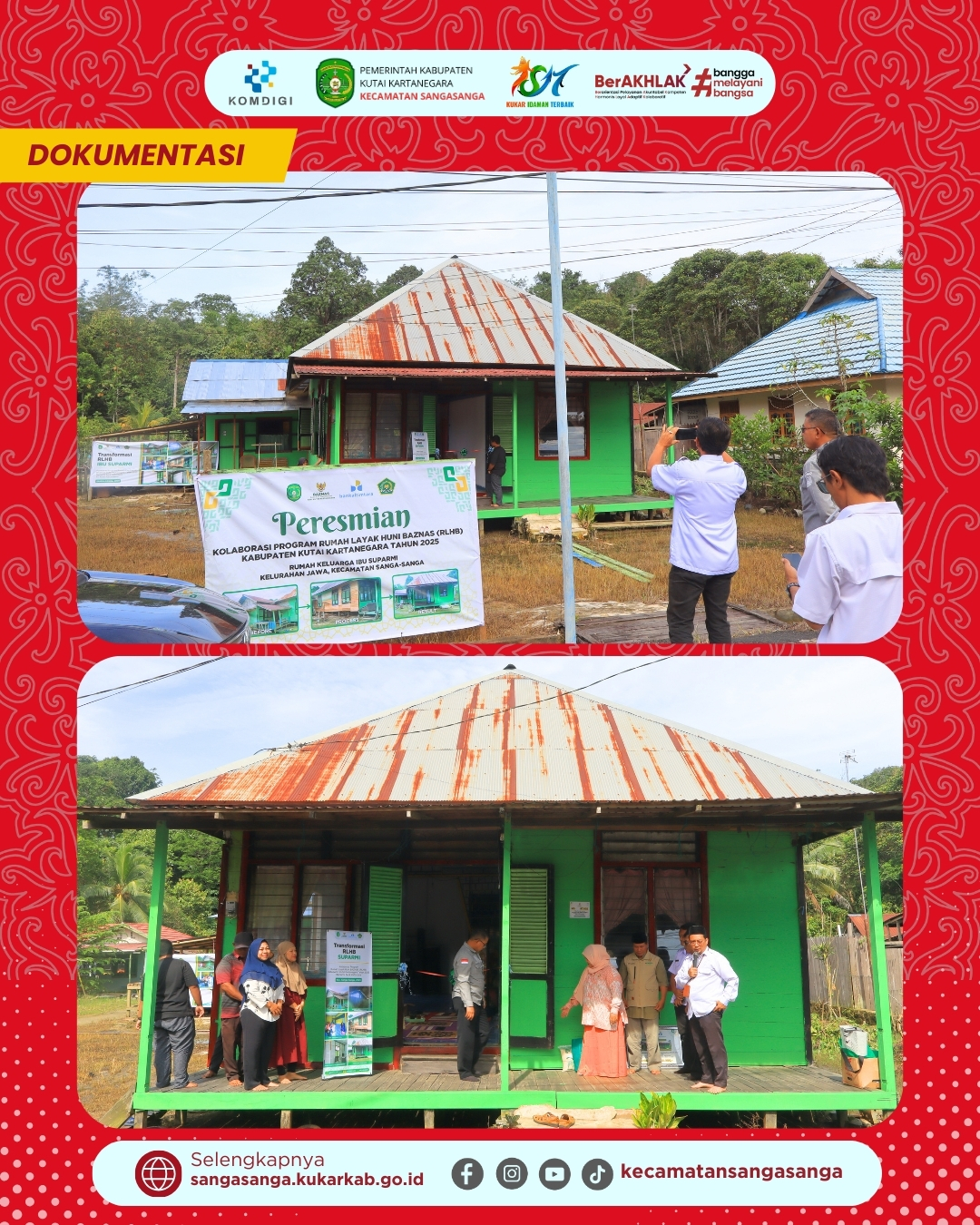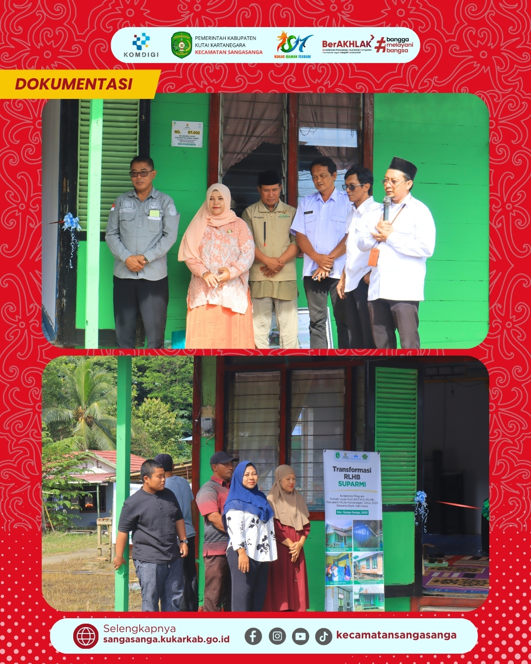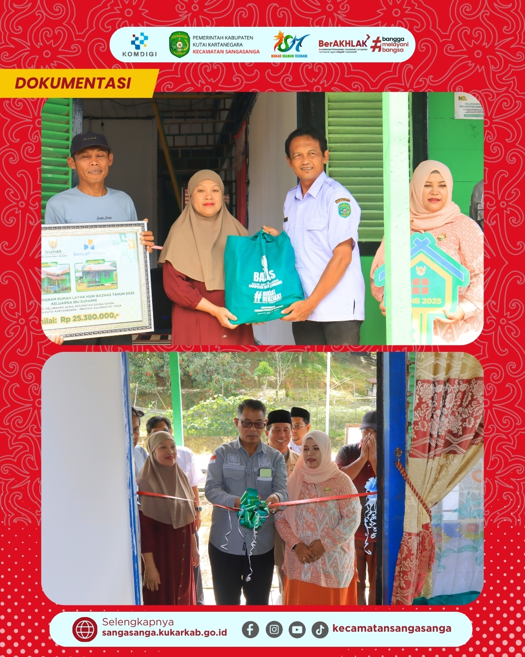 Hadir pula dalam peresmian tersebut, Wakil Ketua II BAZNAS Kabupaten Kutai Kartanegara, Ibu Wiwik Anggraini, S.Sos.I., M.Pd., yang secara simbolis menyerahkan bantuan senilai Rp 25.380.000,- untuk renovasi hunian tersebut. Beliau menjelaskan bahwa transformasi rumah ini melalui berbagai tahapan pengerjaan, mulai dari monitoring awal, proses pembangunan dinding dan atap, hingga tahap penyelesaian akhir. Melalui publikasi dokumentasi sebelum dan sesudah renovasi, masyarakat dapat melihat transparansi penyaluran dana zakat yang dikelola oleh lembaga tersebut. Selain bantuan bangunan fisik, pihak Baznas juga menyalurkan bantuan pendukung berupa bahan pangan pokok bagi keluarga penerima manfaat. Penutupan kegiatan diisi dengan doa bersama sebagai rasa syukur atas suksesnya pembangunan perbaikan rumah tersebut.