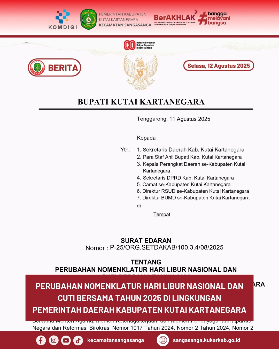 Surat edaran dari Bupati Kutai Kartanegara, Nomor: P-25/ORG.SETDAKAB/100.3.4/08/2025, mengenai perubahan Hari Libur Nasional dan Cuti Bersama Tahun 2025 telah diterbitkan pada 11 Agustus 2025. Surat edaran ini ditujukan kepada berbagai pihak, termasuk Camat se-Kabupaten Kutai Kartanegara.