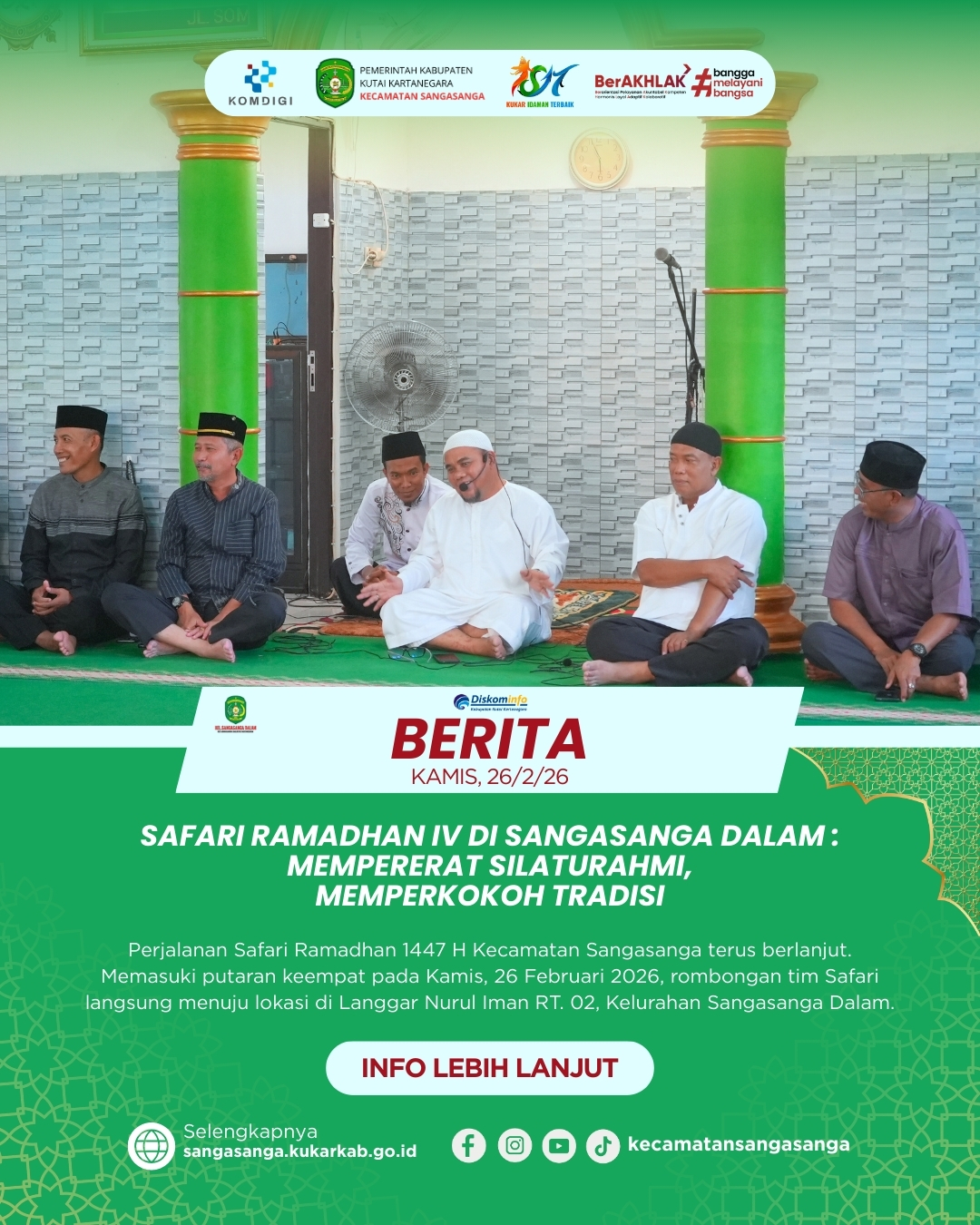 SANGASANGA – Agenda rutin Safari Ramadhan 1447 H Pemerintah Kecamatan Sangasanga terus berlanjut dan kini memasuki putaran keempat pada Kamis, 26 Februari 2026. Kegiatan kali ini dipusatkan di Kelurahan Sangasanga Dalam, tepatnya bertempat di Langgar Nurul Iman RT. 02. Berbeda dengan pelaksanaan sebelumnya, pada kesempatan ini rombongan tim Safari Ramadhan Kecamatan langsung menuju lokasi acara untuk mengefisiensikan waktu pertemuan dengan warga setempat. Kehadiran jajaran aparatur kecamatan disambut hangat oleh pengurus langgar serta tokoh masyarakat yang telah bersiap sejak sore hari. Antusiasme warga terlihat jelas dari partisipasi mereka yang memenuhi area ibadah untuk mengikuti rangkaian kegiatan syiar Islam ini.