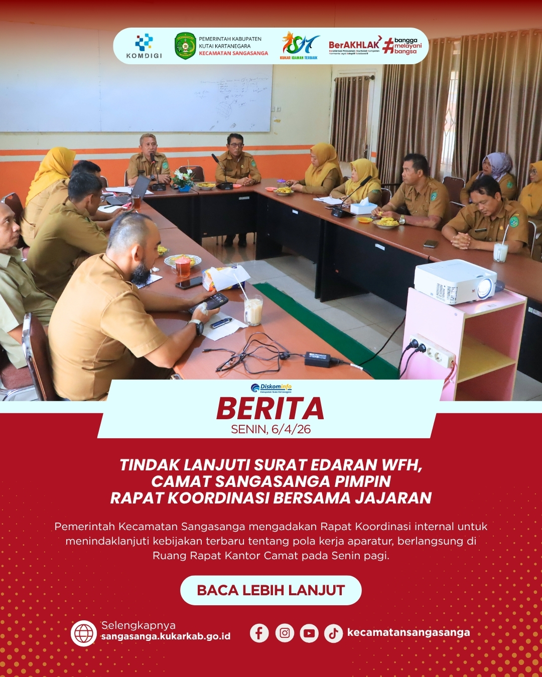 Melalui rapat koordinasi ini, diharapkan seluruh jajaran struktural di Kecamatan Sangasanga memiliki kesamaan persepsi dalam mengimplementasikan aturan tersebut. Pemerintah Kecamatan Sangasanga berkomitmen untuk tetap responsif terhadap kebutuhan masyarakat di tengah dinamisnya kebijakan pengaturan kerja yang ada.