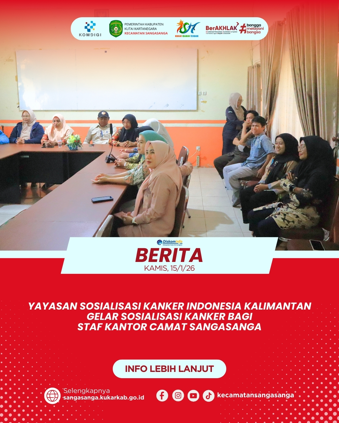 SANGASANGA – Yayasan Sosialisasi Kanker Indonesia (YSKI) Kalimantan menggelar kegiatan edukasi kesehatan yang ditujukan bagi seluruh staf di lingkungan Kantor Camat Sangasanga pada Kamis (15/1). Kegiatan ini dilaksanakan menindaklanjuti undangan resmi dari YSKI Kalimantan sebagai upaya preventif dalam menekan angka penderita kanker di wilayah setempat. Acara yang dimulai tepat pukul 10.00 WITA tersebut bertempat di ruang rapat Kantor Camat Sangasanga dengan dihadiri oleh jajaran aparatur sipil negara dan tenaga bantuan. Seluruh peserta tampak antusias menyimak pemaparan materi yang disampaikan oleh tim ahli dari yayasan tersebut. Pertemuan ini menjadi momentum penting dalam meningkatkan kesadaran kolektif mengenai bahaya penyakit tidak menular di lingkungan kerja.